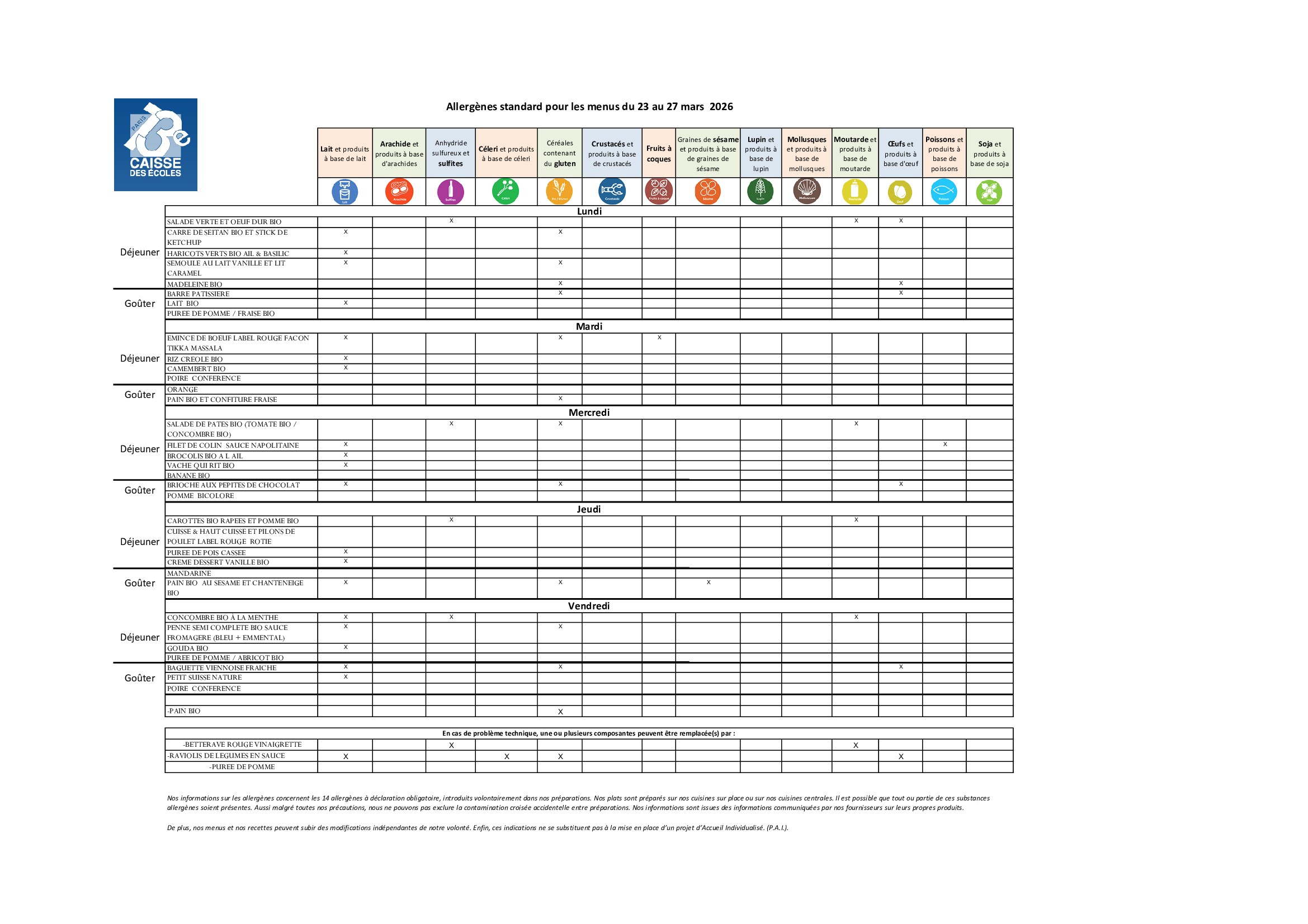 Menu de la semaine du 23 au 27 mars 2026